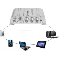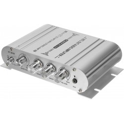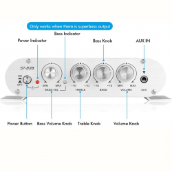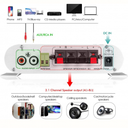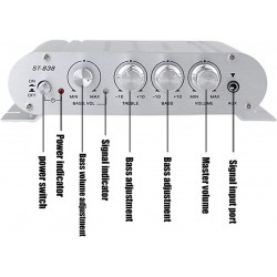 Es un amplificador compacto diseñado para alimentar un sistema de sonido 2.1, es decir, dos altavoces estéreo y un subwoofer. Funciona con alimentación de 12 a 15 voltios, por lo que puede usarse tanto en autos como en equipos domésticos pequeños. Ofrece controles de volumen, graves y agudos, y permite mejorar la potencia y calidad del audio de dispositivos como computadoras, reproductores, radios o sistemas caseros