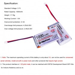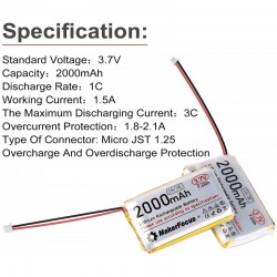 Voltaje: 3.7V (voltios), que es el voltaje nominal típico para baterías LiPo de una sola celda.