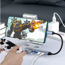 Es un adaptador multipuesto que convierte un solo puerto USB-C en cinco conexiones adicionales, permitiéndote conectar varios dispositivos al mismo tiempo, incluyendo memorias USB, cables de carga, teclados, discos duros, etc.
