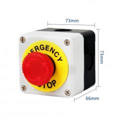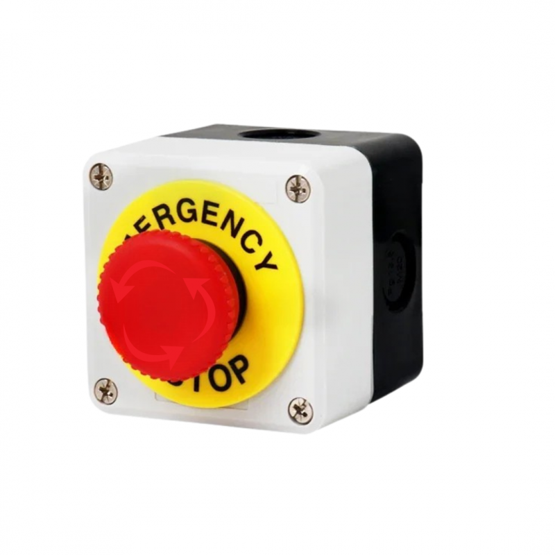 Dispositivo de seguridad utilizado para detener maquinaria o procesos en caso de emergencia. Incluye un botón tipo hongo de gran tamaño montado en una caja plástica resistente, diseñado para instalación rápida y segura en sistemas industriales o de automatización.