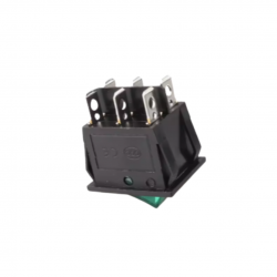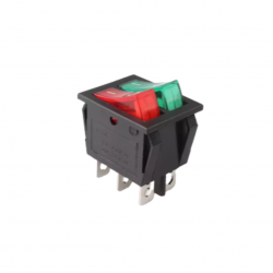 Es un interruptor de doble polo y doble tiro (DPDT), también conocido como doble balancín, con 6 terminales (6P). Permite controlar dos circuitos de manera independiente o invertir la polaridad (muy usado para motores DC).