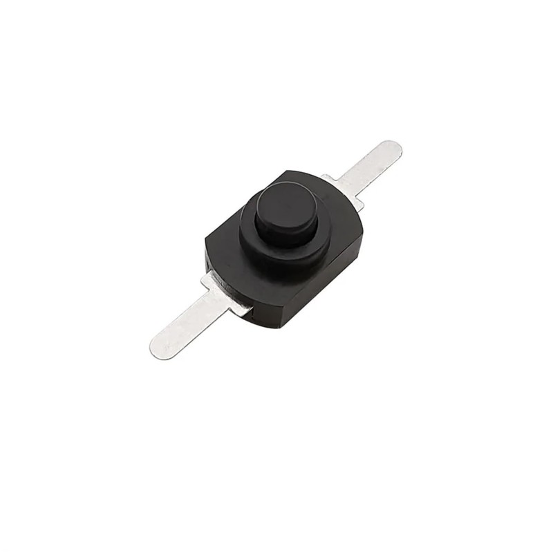 Es un interruptor tipo push button que permanece en la posición activada (encendido) después de presionarlo una vez, y vuelve a la posición de apagado al presionarlo nuevamente.