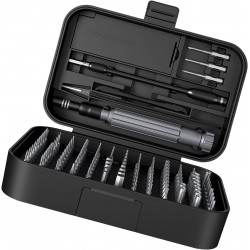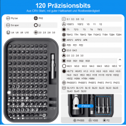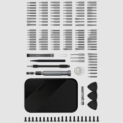 Es un kit de precisión / reparación que contiene un conjunto de puntas de destornillador intercambiables y accesorios, con mango (o mangos) compatibles, pensado para trabajos finos como reparar teléfonos móviles, consolas, laptops, dispositivos electrónicos pequeños, relojes, etc. En español también aparece como “juego de destornilladores de precisión 130 en 1