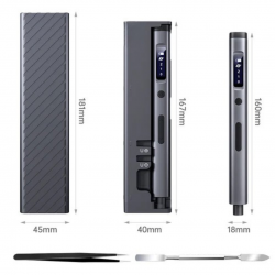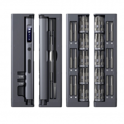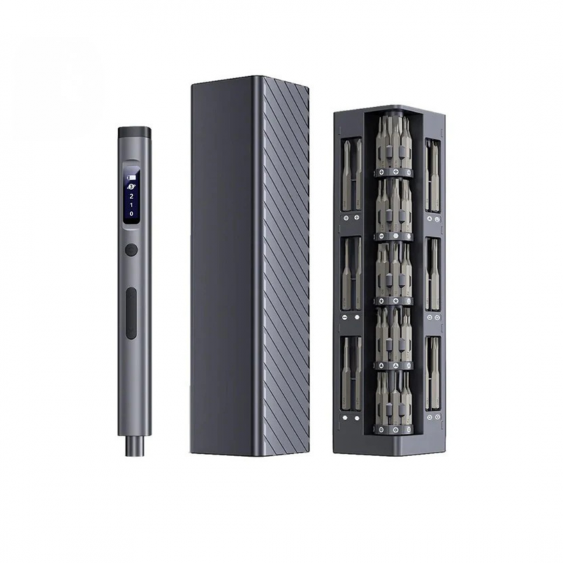 Es un juego de destornillador eléctrico de precisión con múltiples puntas intercambiables, diseñado para reparaciones finas como en teléfonos, laptops, cámaras, relojes y otros dispositivos electrónicos delicados.