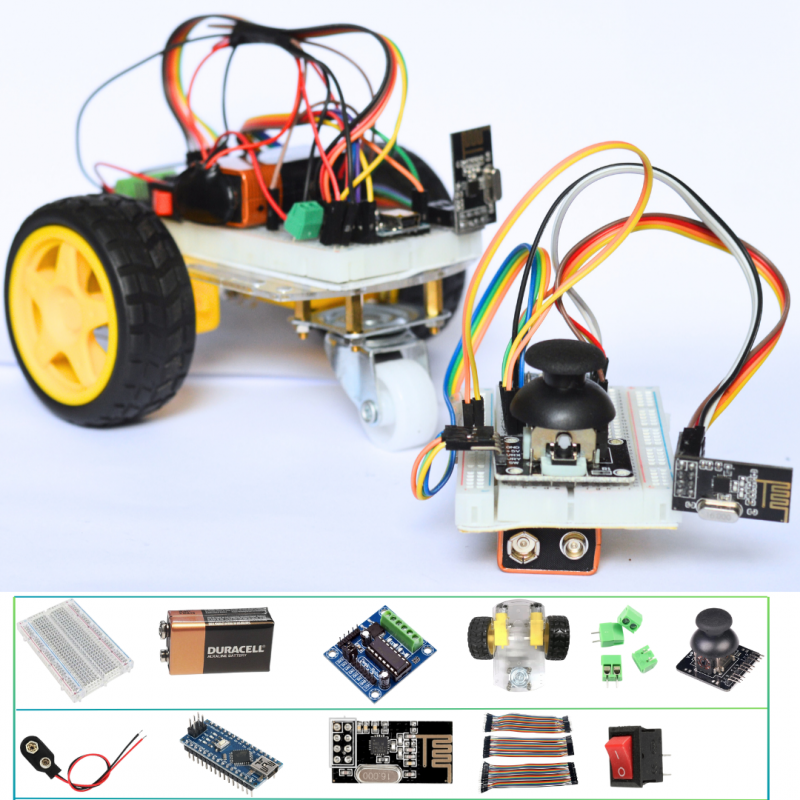 El Carrito RF Control es un vehículo educativo controlado de forma inalámbrica mediante radiofrecuencia (RF). Utiliza tecnología Arduino y el módulo NRF24L01 a 2.4 GHz, permitiendo la comunicación entre un control remoto con joystick y el carrito receptor.